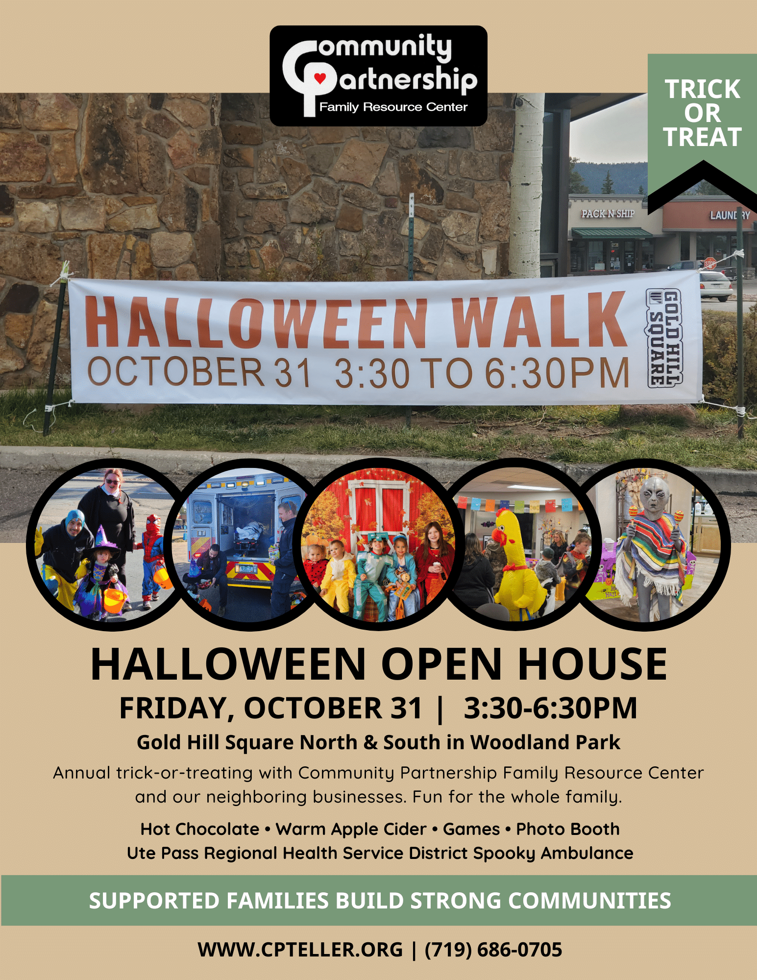 Annual trick-or-treating with Community Partnership and our neighboring businesses in Gold Hill Square North & South in Woodland Park.